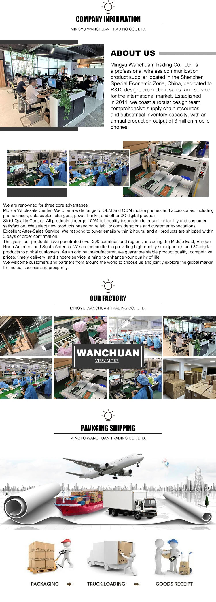 5.Q:What is your terms of packing? A:Generally, we pack our goods in neutral color boxes and cartons. 6.Q.OEM order accepted? What is MOQ? A:Yes.Logo, company name can be printed on products and packages according to customers requirement. About MOQ, 1000pcs for PDA and smart phone; 2000-3000pcs for bar phone. 7. Q: What's the delivery time? A: it will take 7 days after receiving your advance payment .Delivery within 5 days,about 10-20days to finish an order. But the exact time is according to actual situation. 8.Q:About the Freight? The freight is calculation base on Alibaba platform . Alibaba Logistics is recommended. If other logistics are used, the cost and time are uncontrollable. This is also a problem faced by all companies