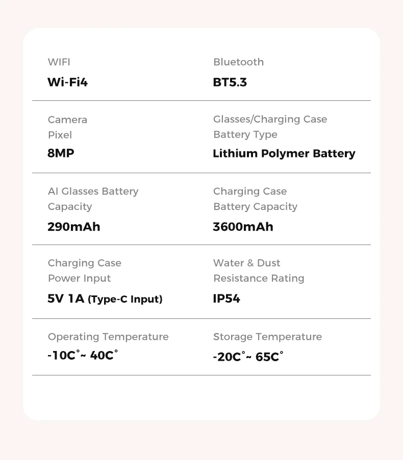 Eyeglass battery: 290mAh /3.8V (3C fast charging, wired)