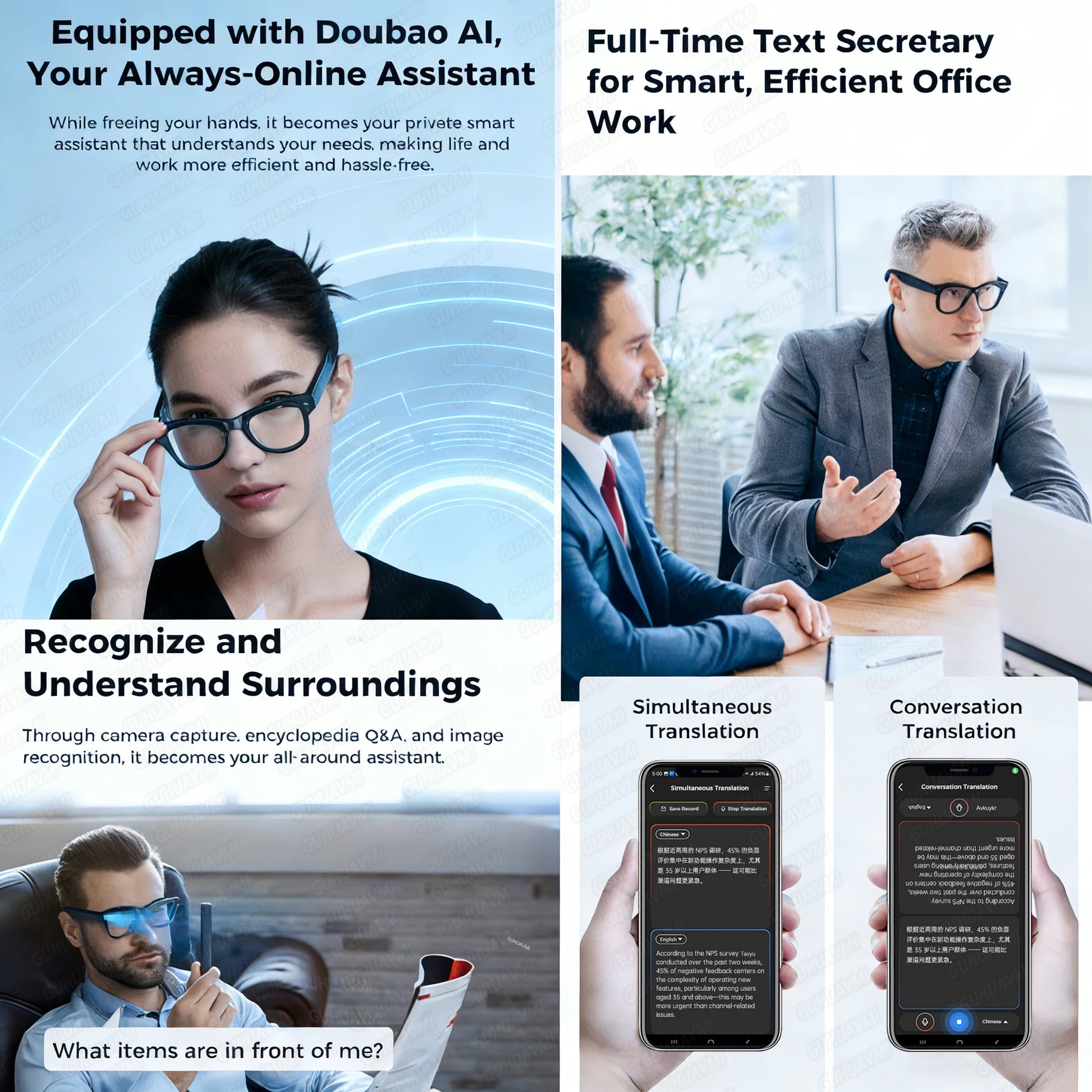 Function: Music,Camera,VIDEO,Gaming,Voice Assistant,calling,Sun protection,Anti-blue light,AI translator,AR,Chat gpt,Ai