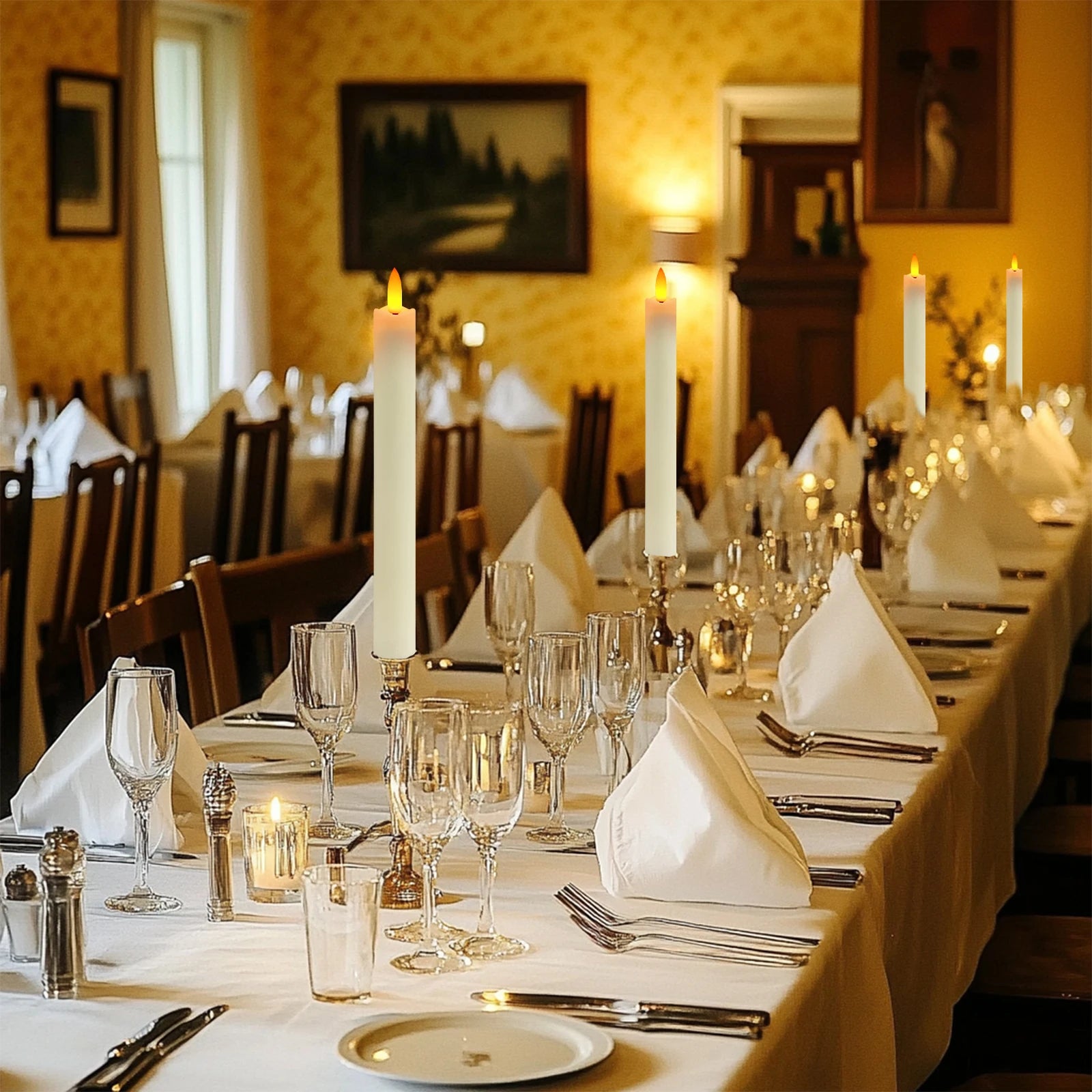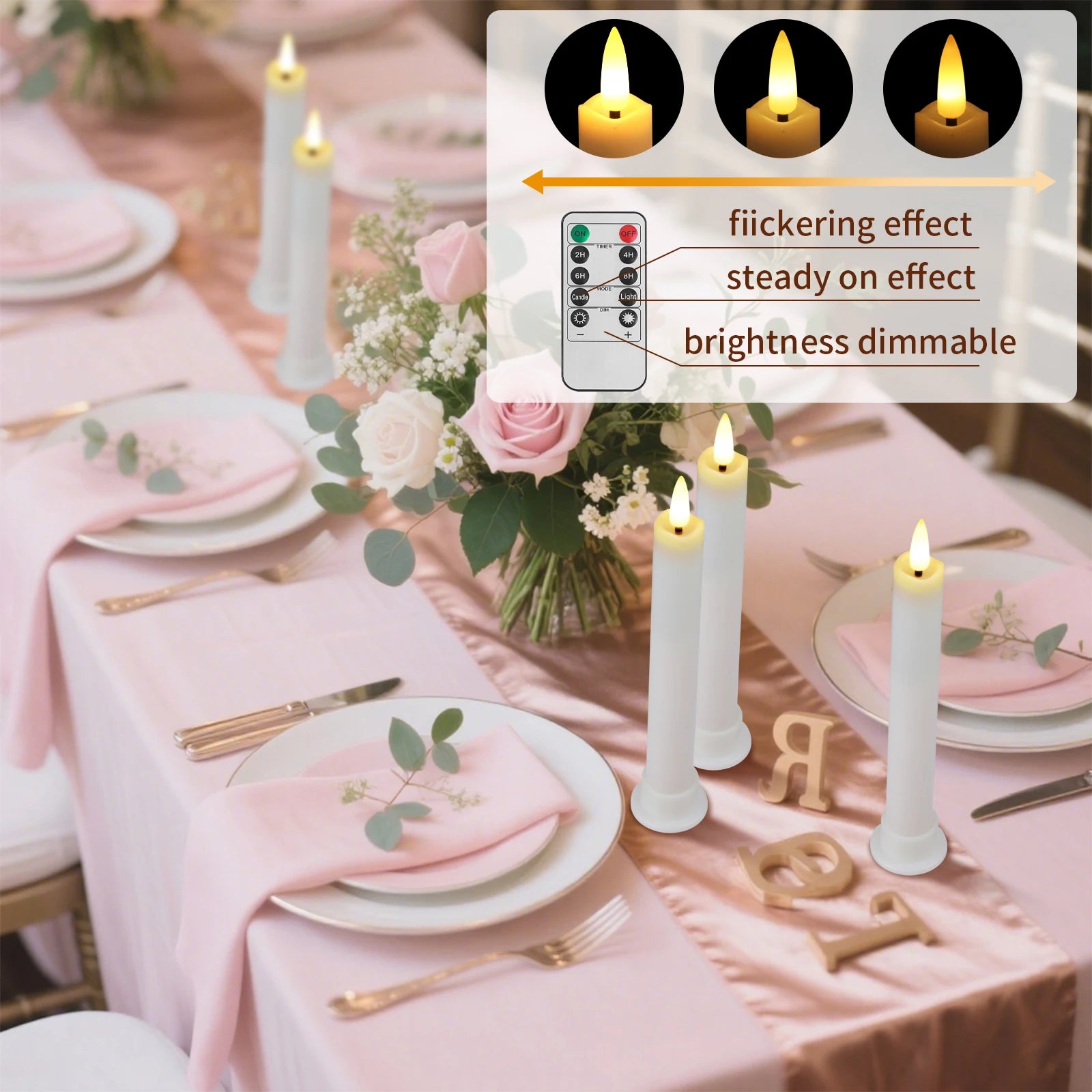 EXCELLENT DESIGN: You don't need to use a candlestick to stand (you can also use it with a candlestick), These taper candles made 3D Wick realistic flicker design, feels and looks like a real wax taper candle flame. Warm light glow creates a romantic atmosphere when use as dinner, party, wedding, birthday, Christmas home decoration