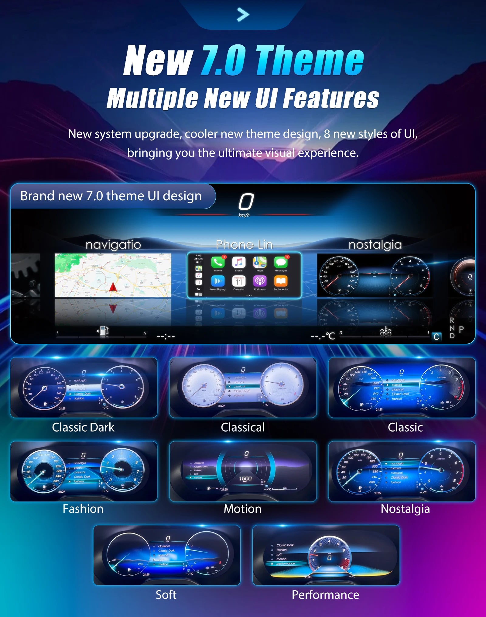 3.3 or 4 kinds of mode you can choose (simple, comfort, technology, track) and 4 kinds of theme color