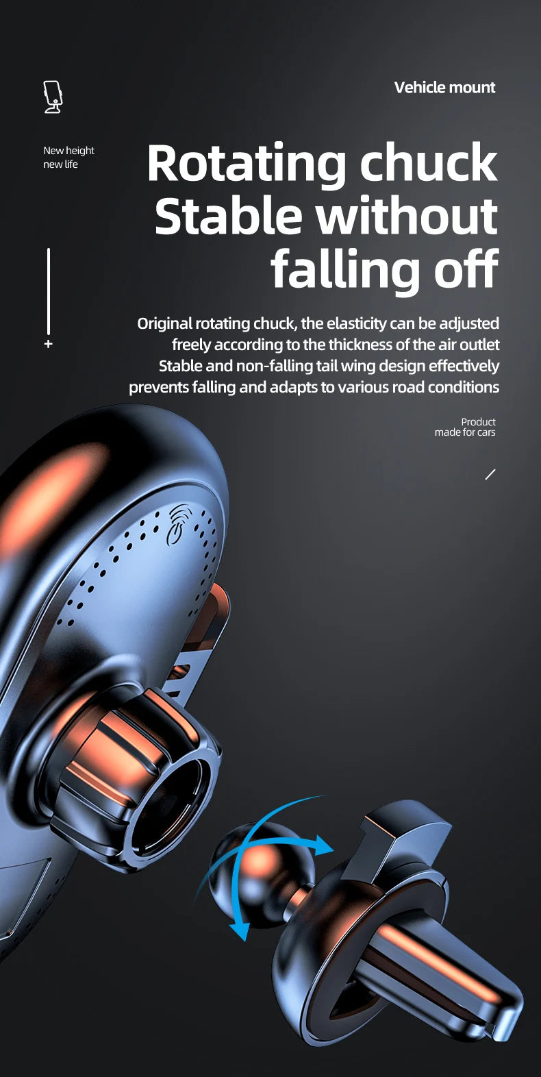 360-degree rotating cradle provides flexible choice of watching your phone or GPS while driving. That means there will be no blocked vision and you can get a perfect viewing angle with the car wireless charger mount.