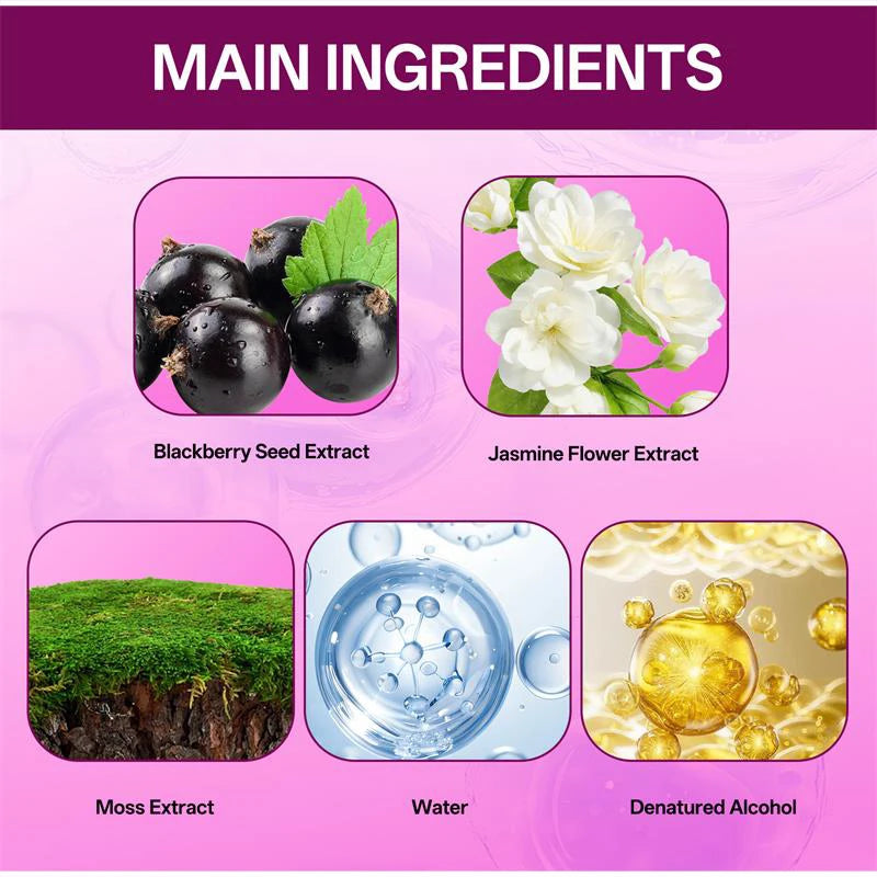 Water, Denatured Alcohol, Jasmine Flower Extract. Blackberry Seed Extract, Fragrance,Phenoxyethanol, Moss Extract
