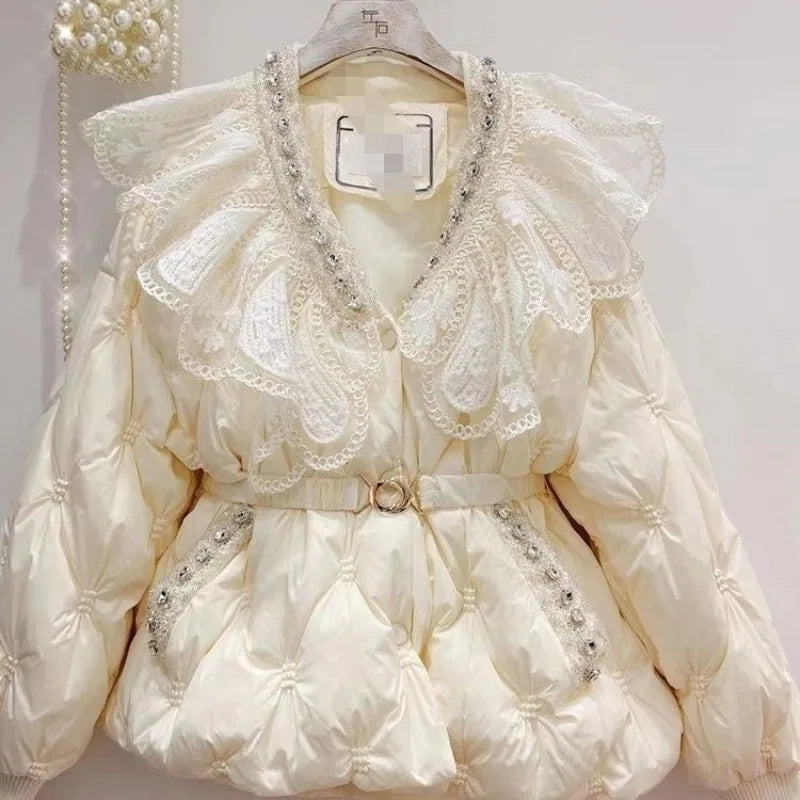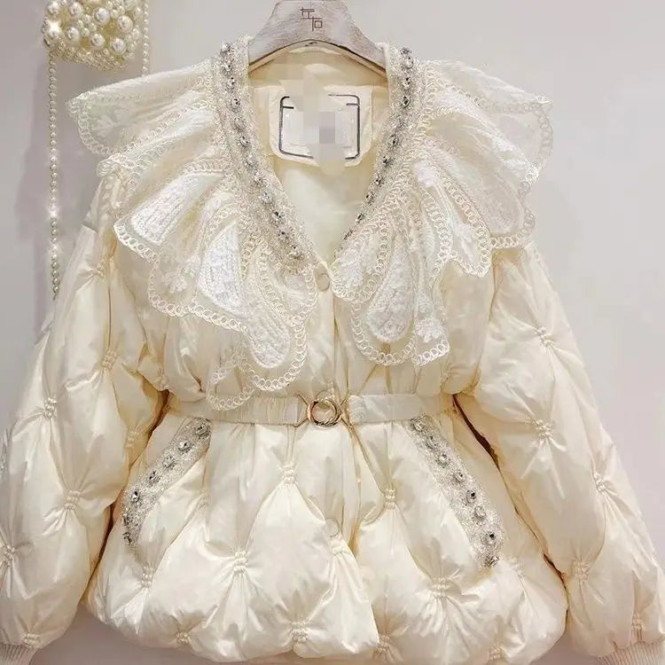 Cotton Padded Women's Coat Winter Parkas Sweet Heavy Industry Water Diamond Doll Collar, Waist Cinching Warm Cotton Clothing