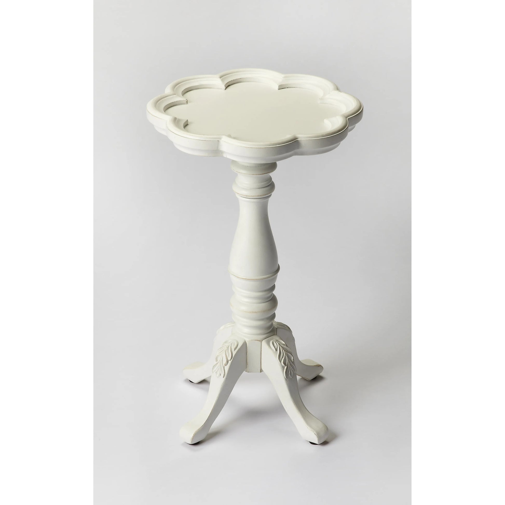 Distinctive in style the 20" cottage white wood floral top end table radiates a versatile charm. Offering a nice color combination, the top of this manufactured wood table is cottage white, while the base compliments it nicely in white. The purposefully distressed finish gives this table an authentically rustic feel. An ideal location for placing your snacks and drinks, and a place to keep your lamp, frames, or other accessories. This versatile table is a great accent for most any room. 20" H x 12" W x 12" D