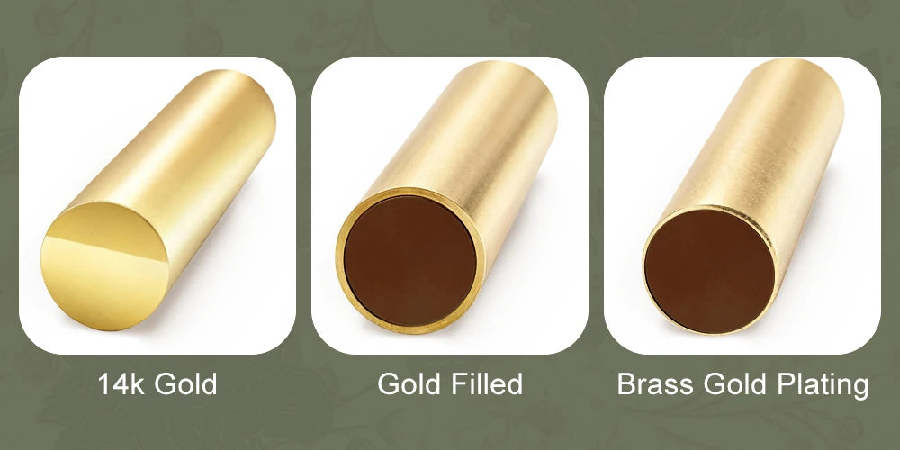 Le plaqué or utilise une couche d'or massif collée à un noyau en laiton. Nos produits sont plaqués or avec 1/20e d'or 14 carats.