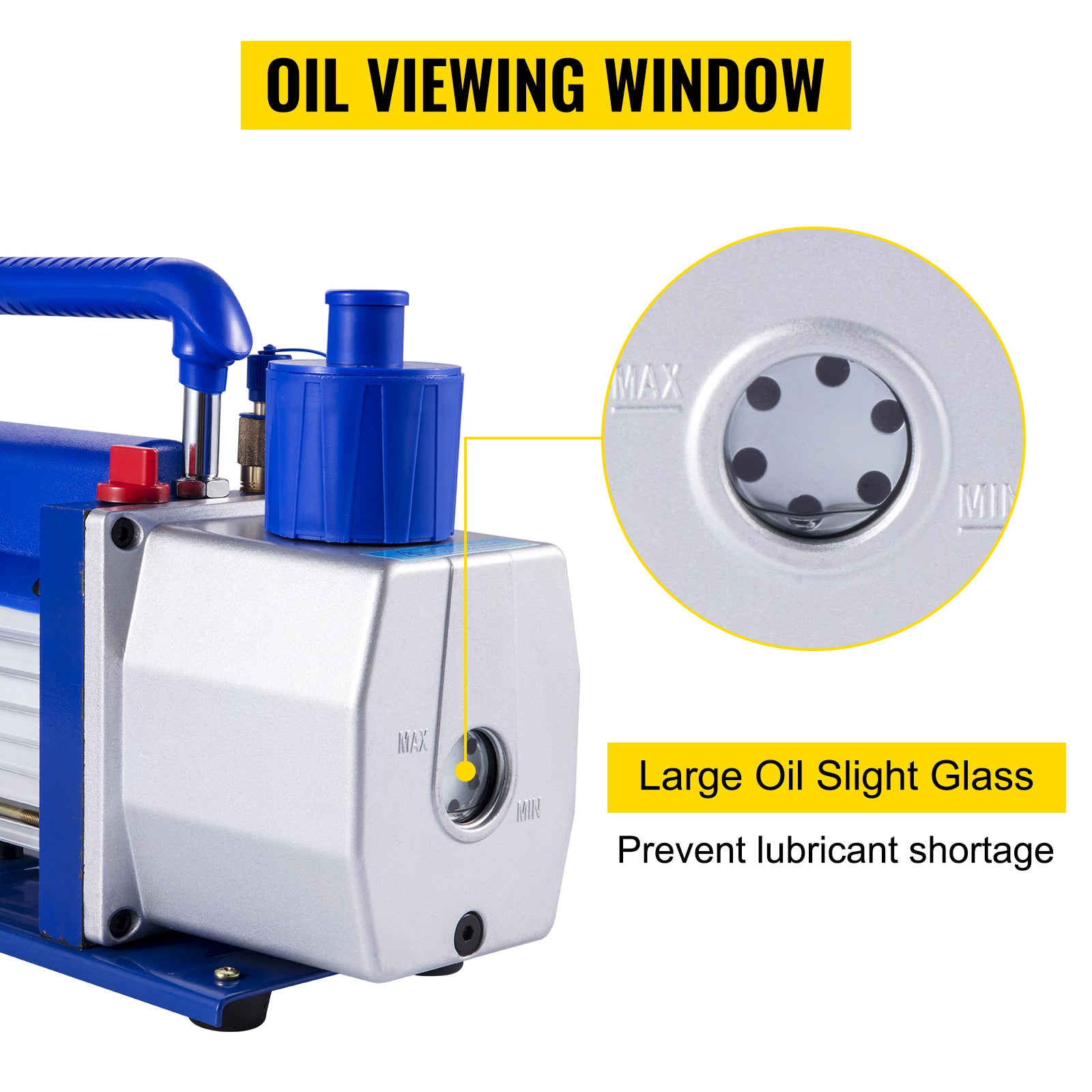 Easy Monitoring & Cooling: With an oil viewing window, this AC vacuum pump can easily monitor oil levels to avoid oil deficiency. Our vacuum pump tool can cool itself and prevent itself from burning out. The built-in thermal protection prevents the machine from burning and extend the machine's life.